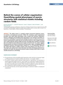 Nicolaou, K., Passmore, J., Kapitein, L., Mulder, B., & Berger, F. (2025). Behind the scenes of cellular organization: Quantifying spatial phenotypes of puncta structures with statistical models including random fields. Mol. Biol. Cell, 36(3), ar22: 1–12. doi:10.1091/mbc.E24-10-0461 |