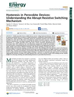 Alvarez, A., de Boer, J., Sonneveld, L., Bleiji, Y., Alarcón-Lladó, E., & Ehrler, B. (2025). Hysteresis in Perovskite Devices: Understanding the Abrupt Resistive Switching Mechanism. ACS Energy Lett., 10(8), 3983–3992. doi:10.1021/acsenergylett.5c01556 |